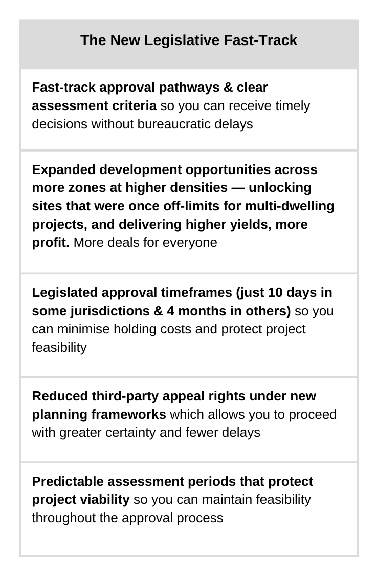 - Approval times slashed in some cases from 12+ months to just 4 months. Which means holding costs smashed, profitability up, and certainty on your outcomes.