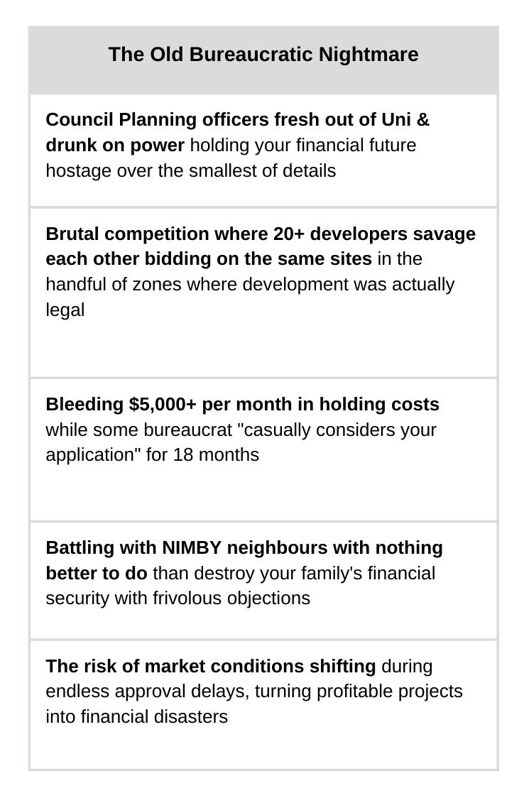 Yet right now, across every state in Australia, government bulldozers are smashing through decades of red tape that trapped millions of dollars in "hidden equity" inside ordinary residential blocks.